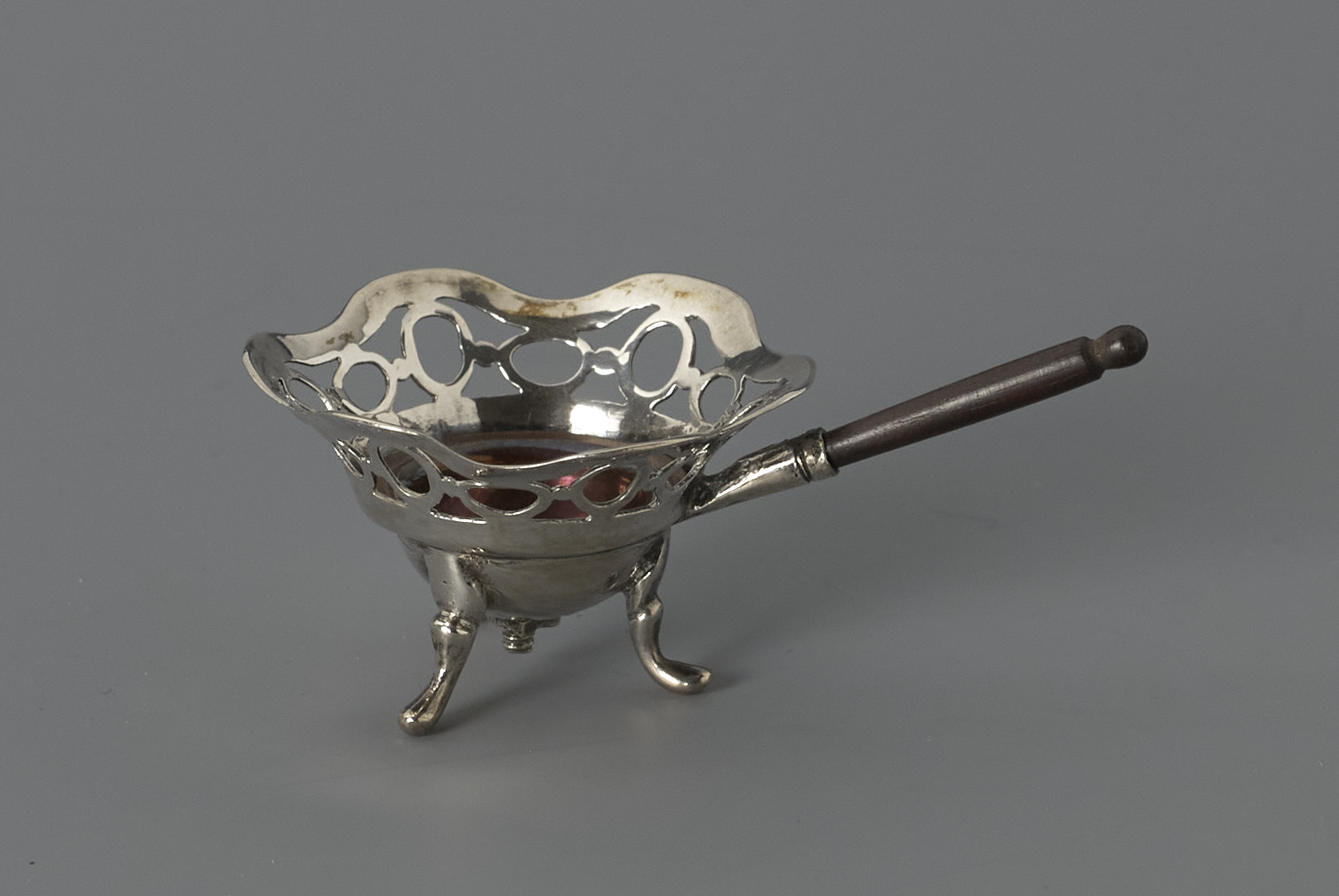 Opengewerkte komfoor met gecontourneerde rand, en houten handvat.