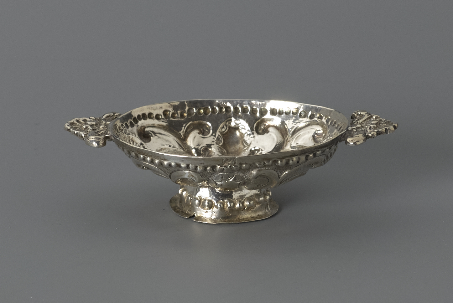 Ovalen brandewijnkom op een voet. met platte oren in de vorm van een schelp. De wand van de kom versierd met gedreven C-voluten.- Trefwoorden