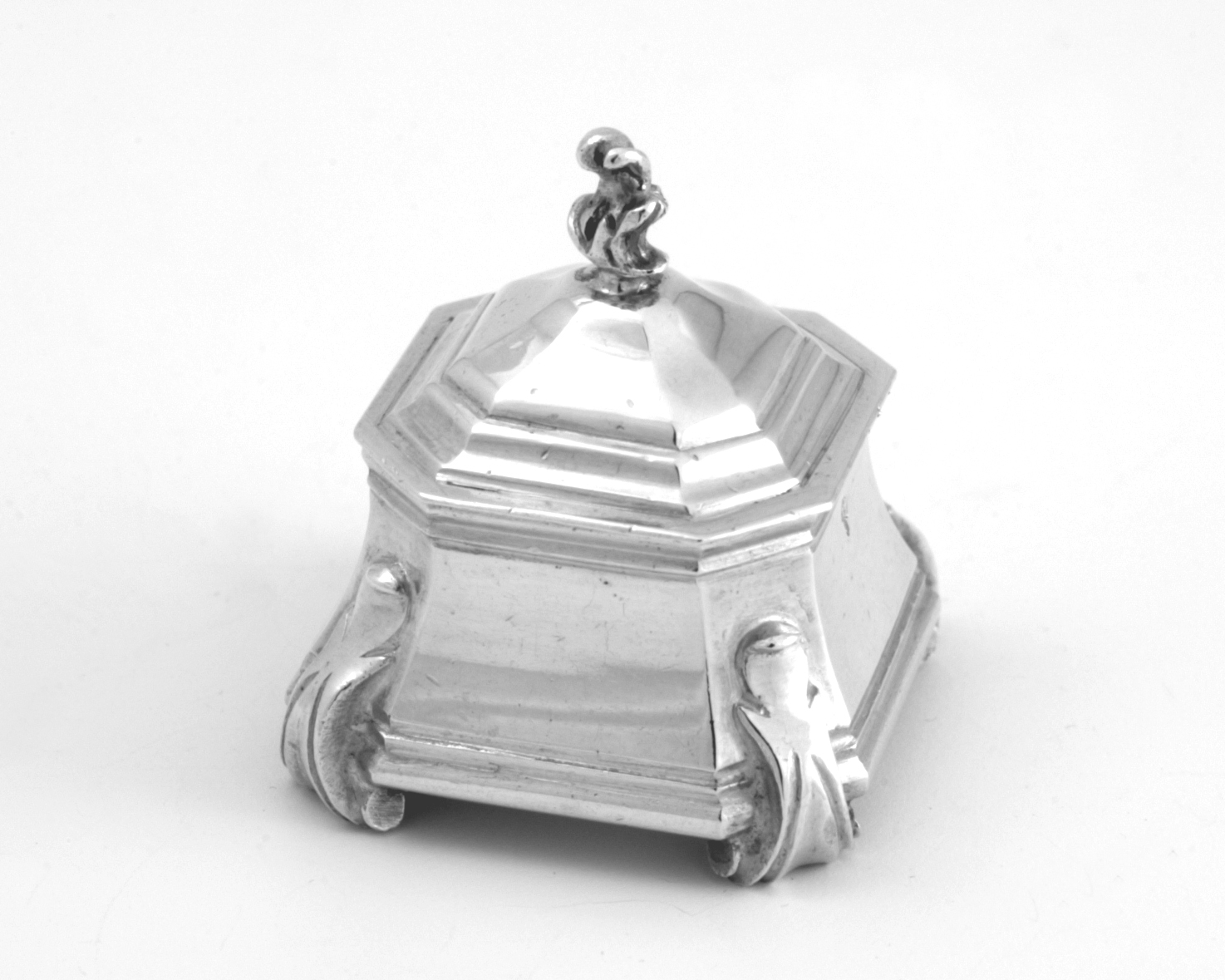 Vierkante tabakspot met afgeschuinde hoeken waarop de vier omgeslagen bladvormige pootjes; gladde ingesnoerde wand met boven en onder een ribprofiel, oversluitend gewelfd en geprofileerd deksel, bekroond met rocaille knop.