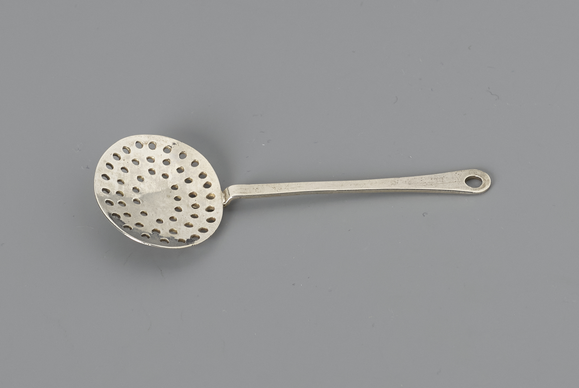 Lichtgewelfde ovale bak met gaatjes in drie cirkels, lange platte steel met rattestaart aanzet en ophangoog.- Trefwoorden