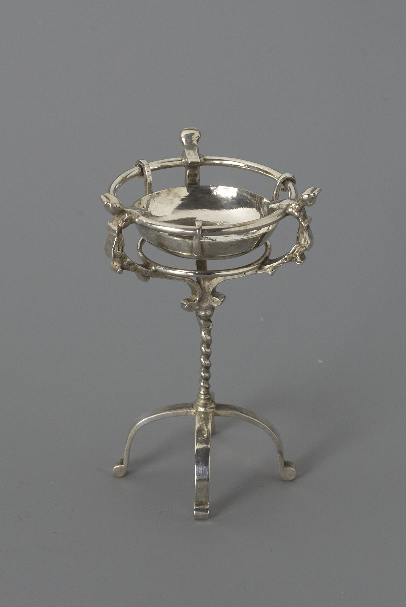 Standaard op een gedraaide stam, die uitloopt in een vierpoot. Op de stam komen vier geprofileerde armen samen die twee draagringen steunen.