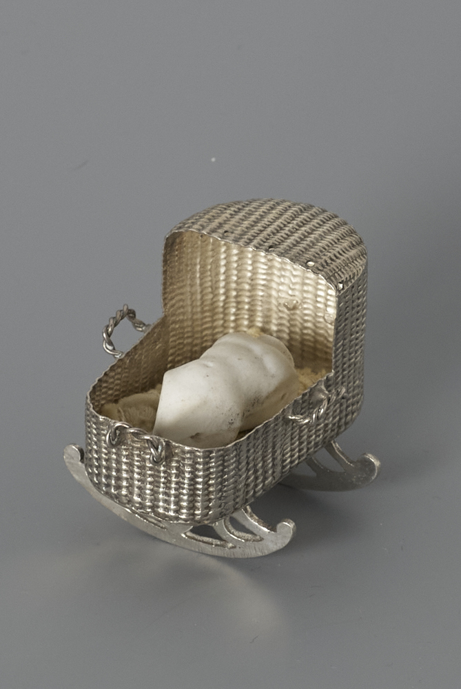 Zilveren wieg in de vorm van een mand, met vier grepen en een halfronde kap, met gehaakt kleedje. Porseleinen poppenromp.