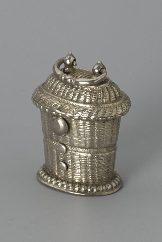 Lodereindoosje in de vorm van een gevlichten mand, met deksel en hanger. Binnenzijde verguld.- Trefwoorden