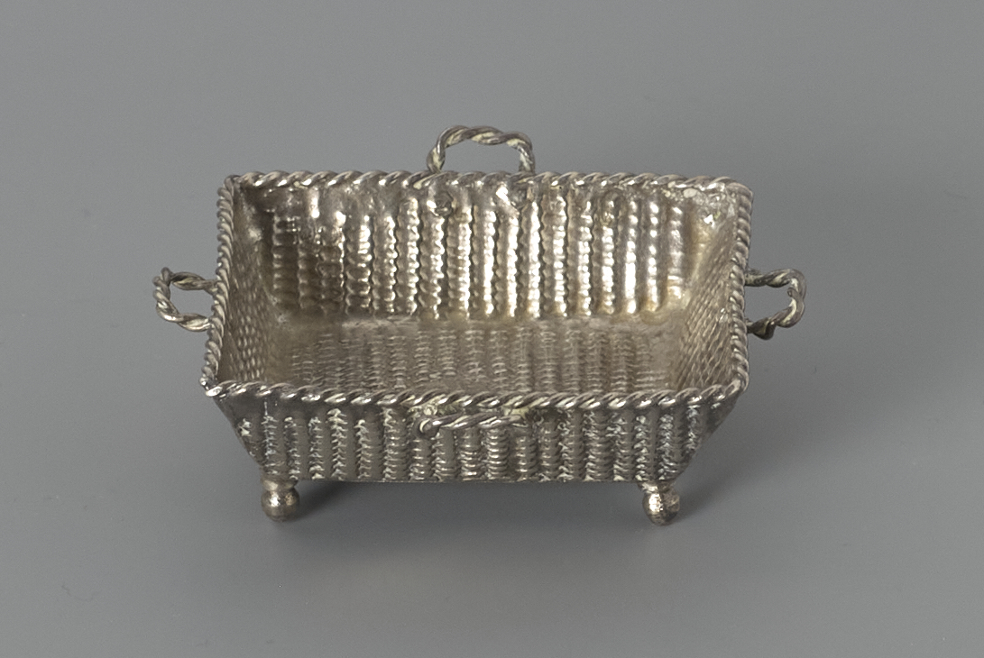 Rechthoekige luiermand op vier poten en met vier handvatten. De mand is bewerkt met nagebootst vlechtwerk.- Trefwoorden