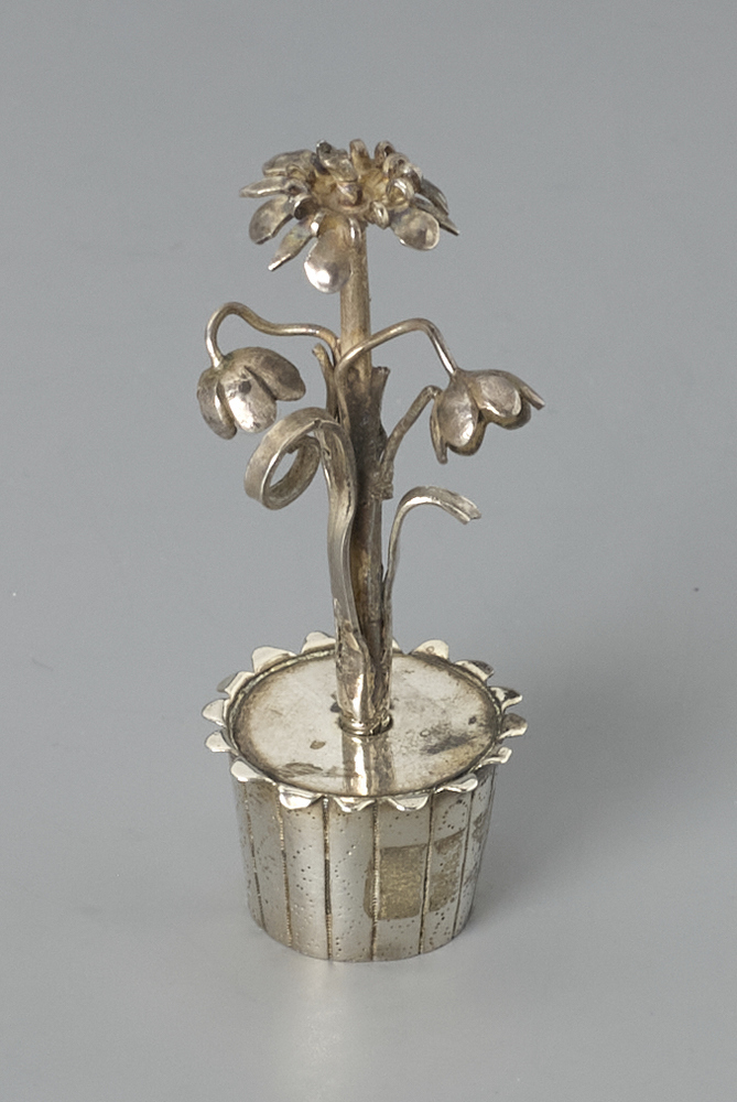 Ronde bloempot met gestileerde bloemen en bladeren.- Trefwoorden