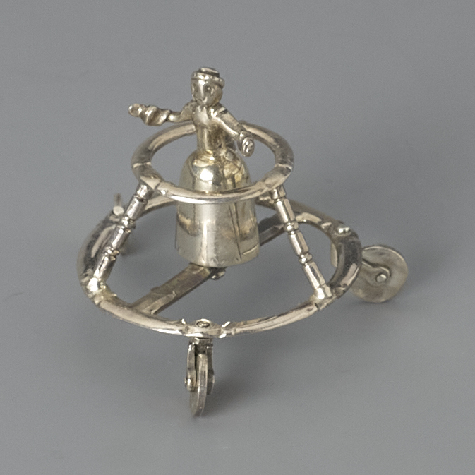 Looprek op vier wielen, drie geprofileerde spijlen en een kinderfiguur in het midden. Het kinderfiguur is draaibaar.- Trefwoorden