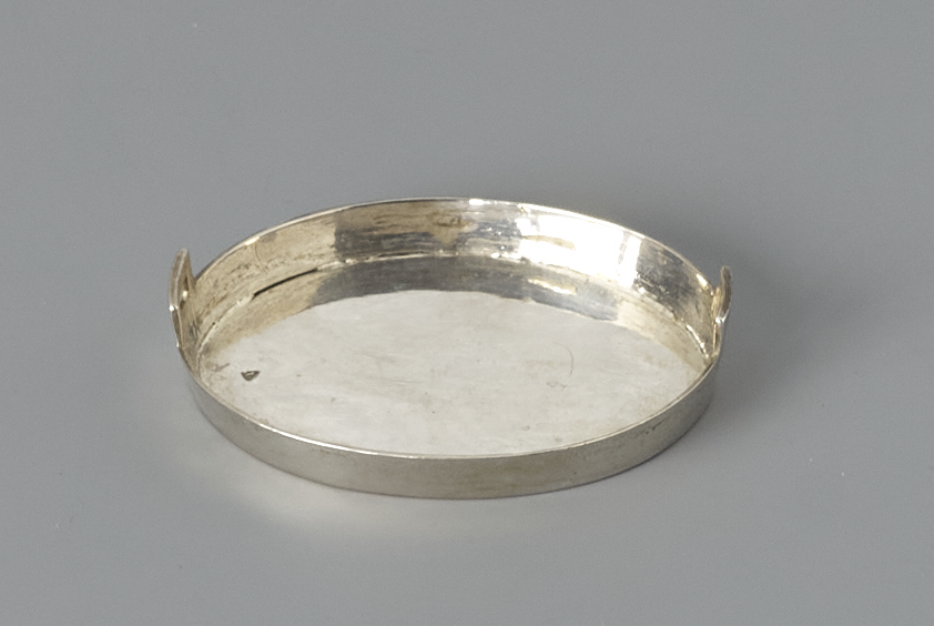 Ovaal dienblad met opstaande rand waarin twee grepen zijn aangebracht op de beide korte zijde .- Trefwoorden
