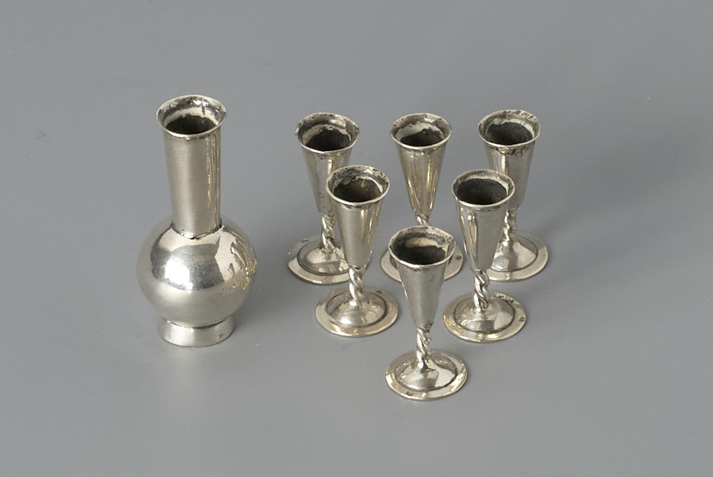 Zes kelkglazen op een getorste voet, karaf met bollebuik waarop een hoge rechte hals met schenkrand.- Trefwoorden