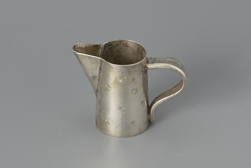 Cilindrische kan met forse schenktuit en oor, deel van thee servies- Trefwoorden
