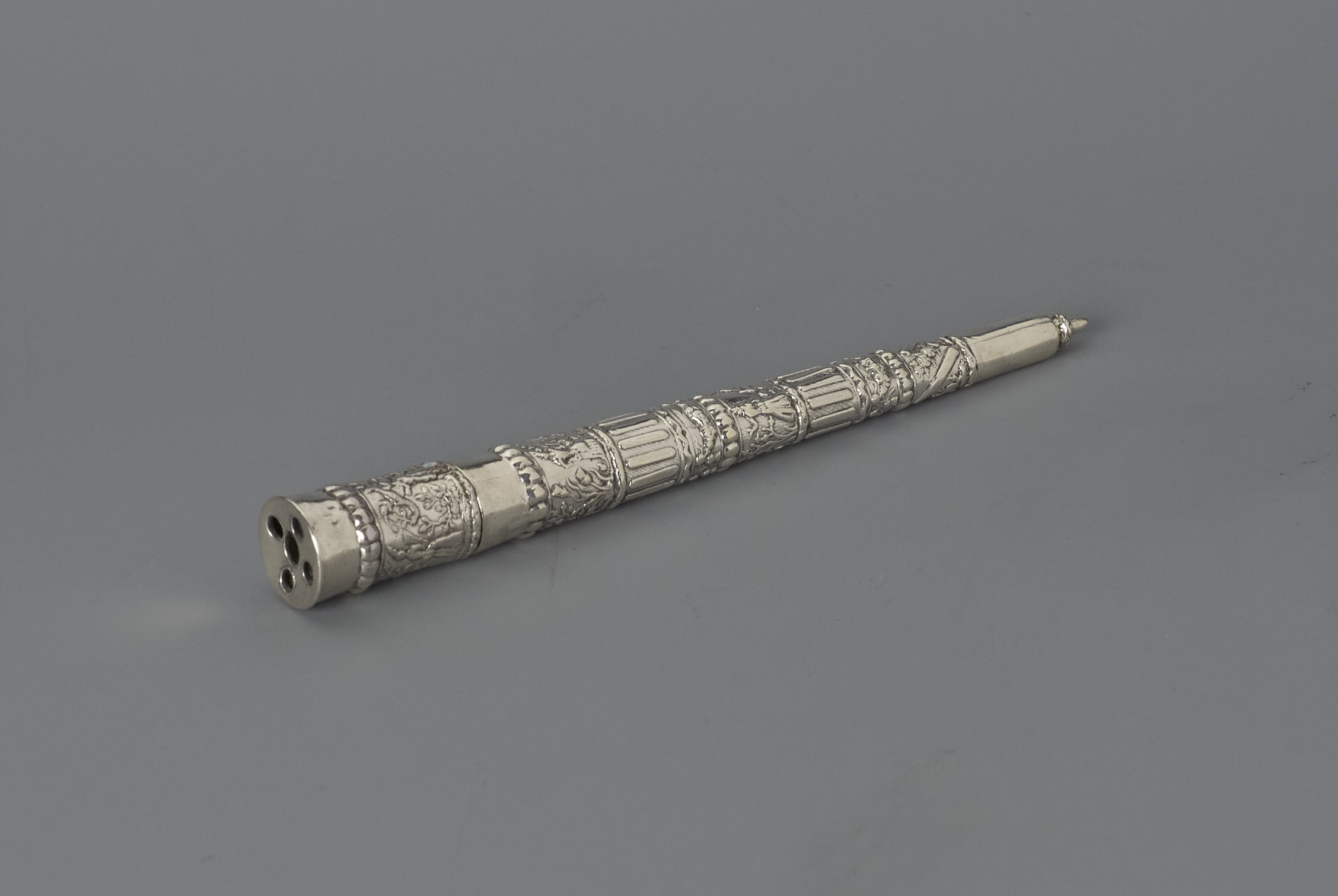 Taps toelopende breischede met verschillende ribben en pastorale voorstellingen in relief, gegraveerd met de initialen GR.- Trefwoorden