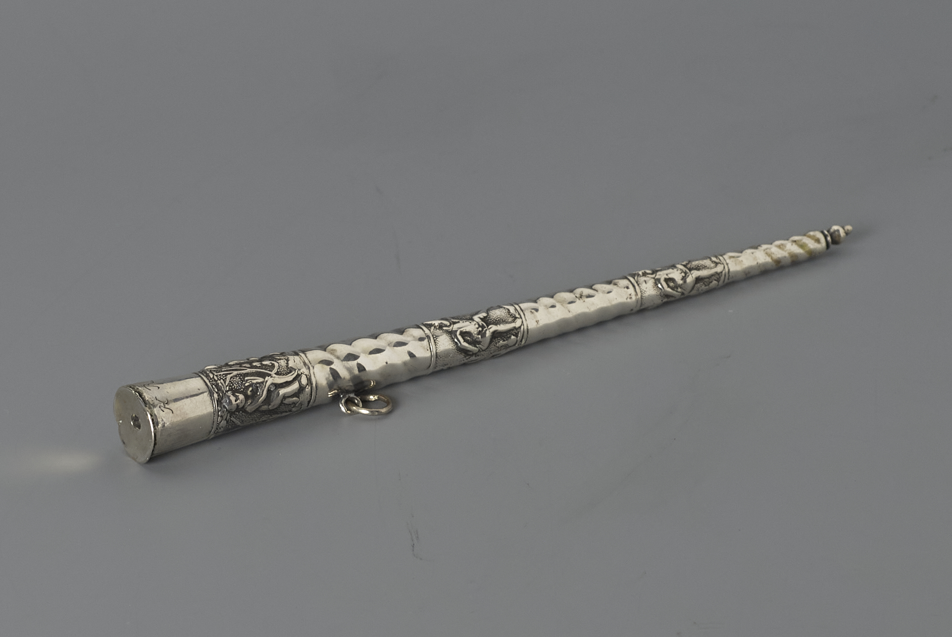 Taps toelopende breischede met verschillende rbben versierd met putti en harlequins. Op de bovenste rib zijn de initialen HR gegraveerd.- Trefwoorden