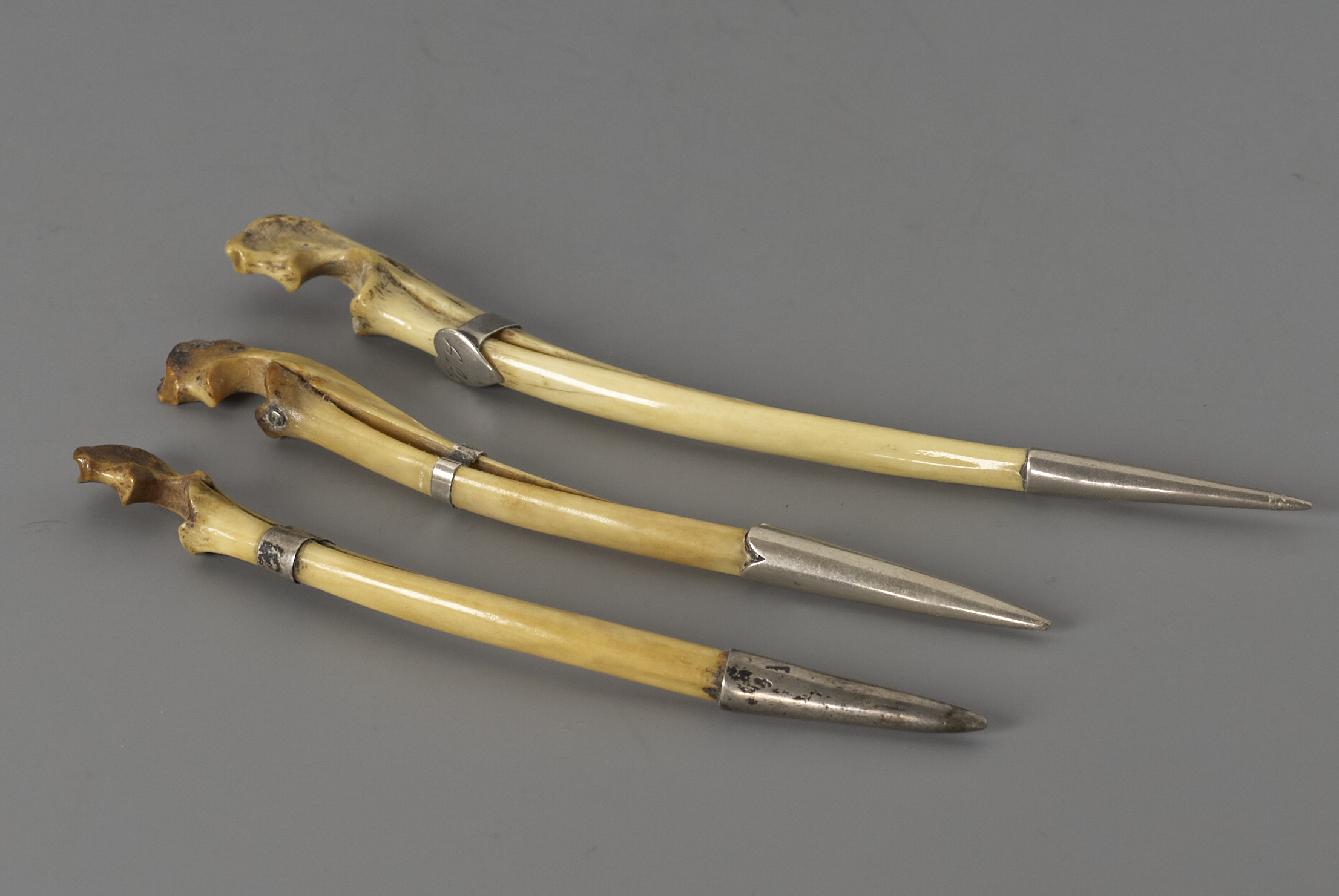 Drie pijpewroeters van verschillende afmetingen, gaamkt van hazespong. De grootste voorzien van een hartvormig schild met de initailen PJS of PJY