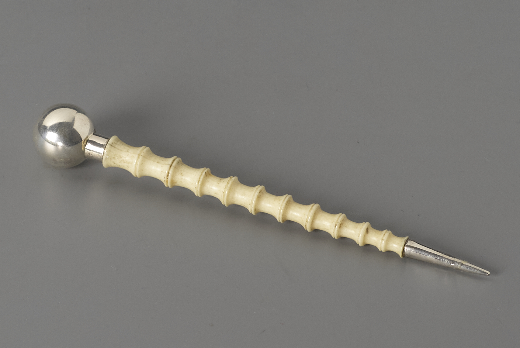 Ivoren pijpewroeter met zilveren knop en knerren.- Trefwoorden