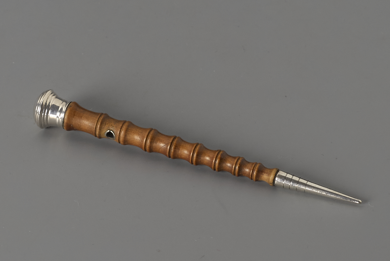 Pijpewroeter met knerren een zilveren knop en uiteinde.- Trefwoorden