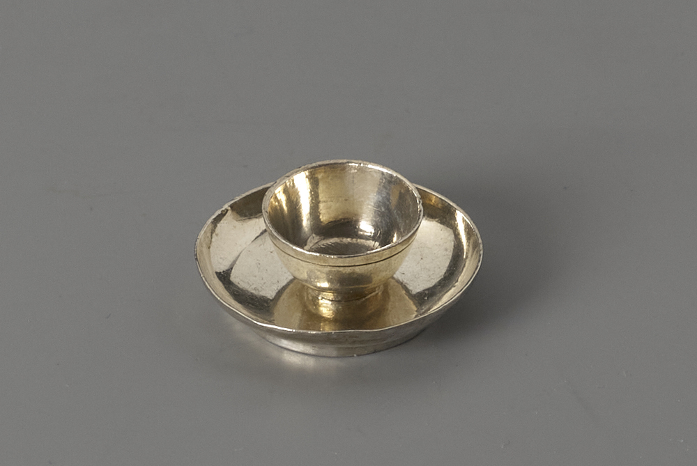 Komvormige kop met ingedraaide ring met een ronde schotel met oplopende rand