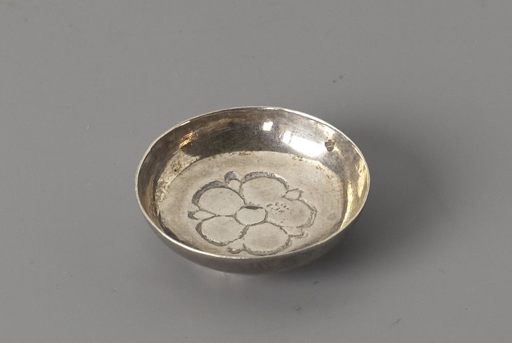 Ronde schaal met in het midden versierd met een bloemmotief.