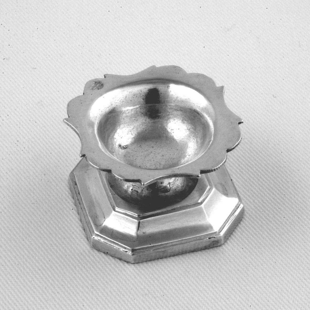 Rond zoutvat met gecontourneerde rand en achthoekige voet.- Trefwoorden
