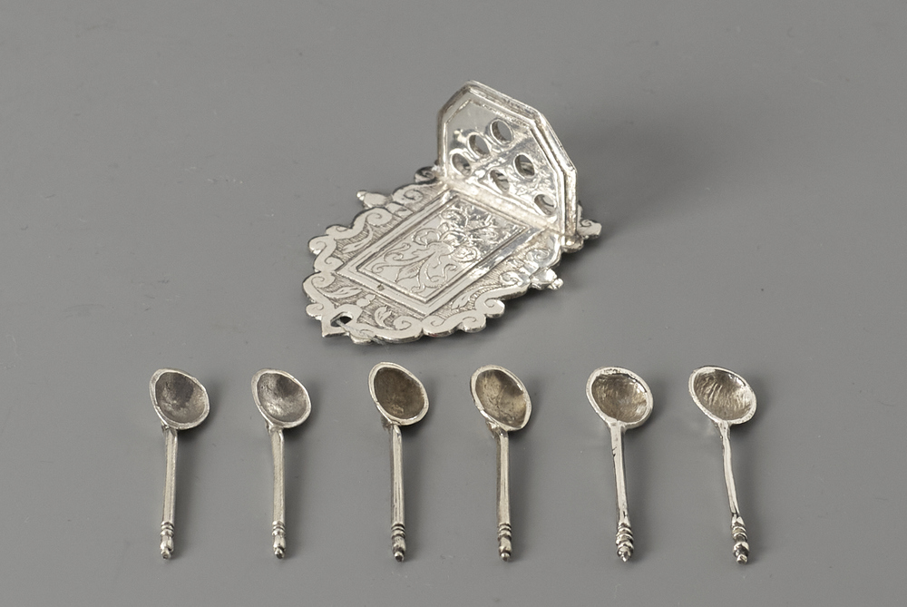 Lepelrek met een achterplaat versierd met S-motieven en gestyleerde bloemen en zes lepels.