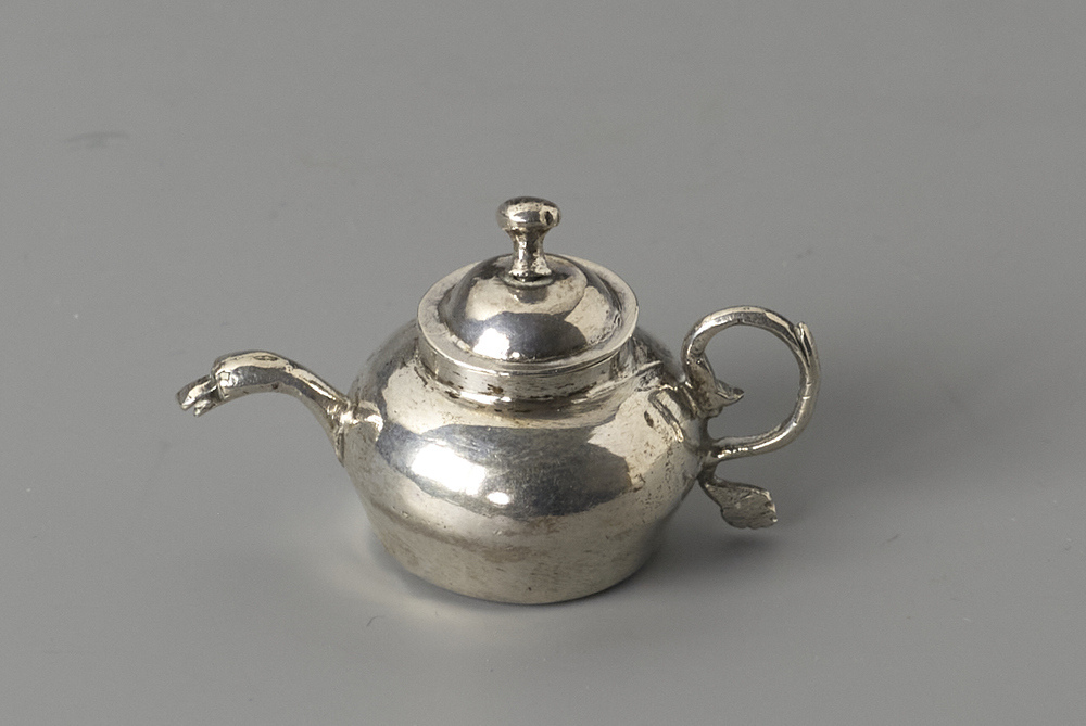 Ronde theepot met een tuit die uitloopt in een zwanenkop.