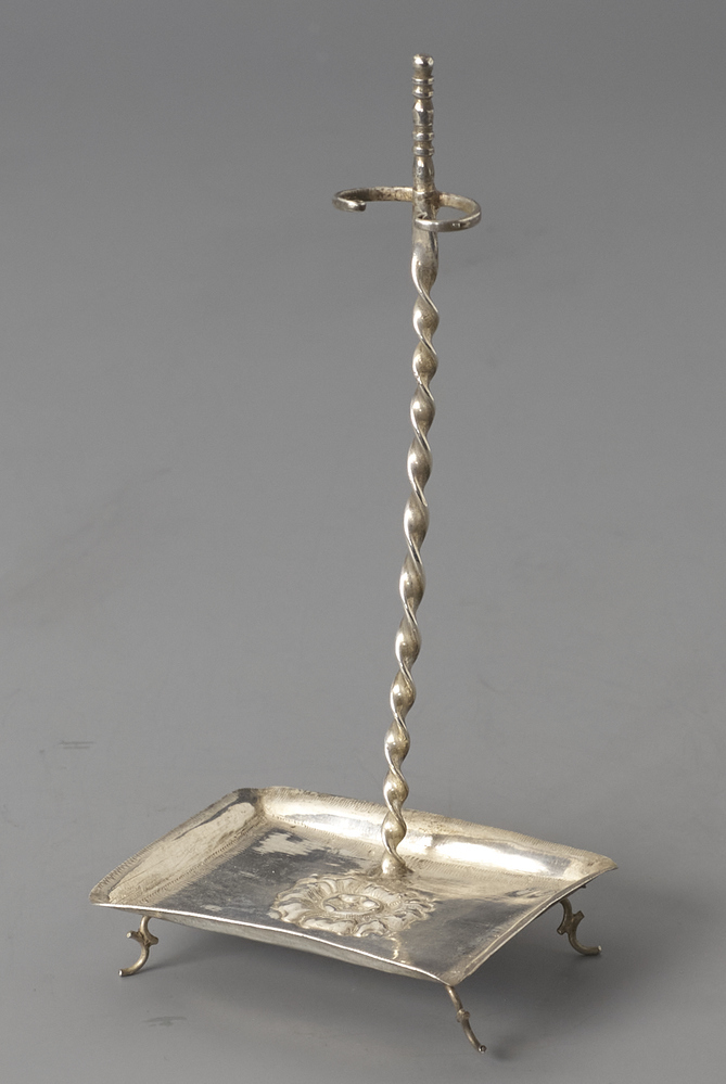 Rechthoekige pijpenstandaard met gedraaide stang op vier pootjes.- Trefwoorden