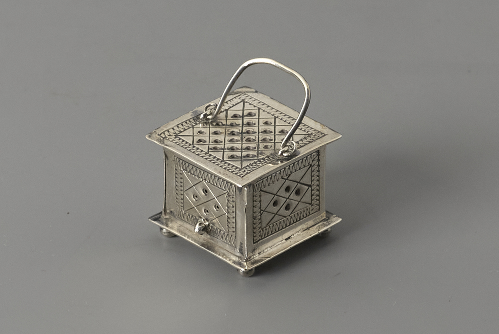 Vierkante stoof met geperforeerde boven- en zijkanten en hengsel op vier bolpootjes.- Trefwoorden