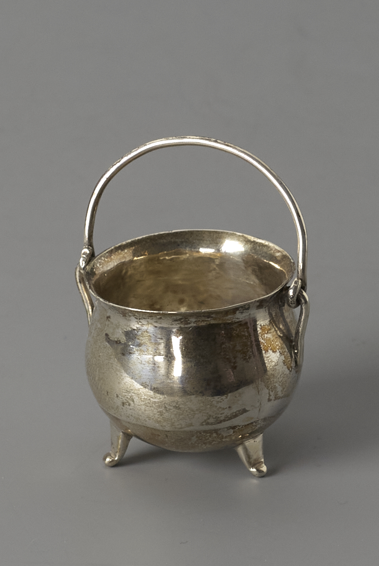 Bolvormige kookpot op drie pootjes met hengsel.- Trefwoorden