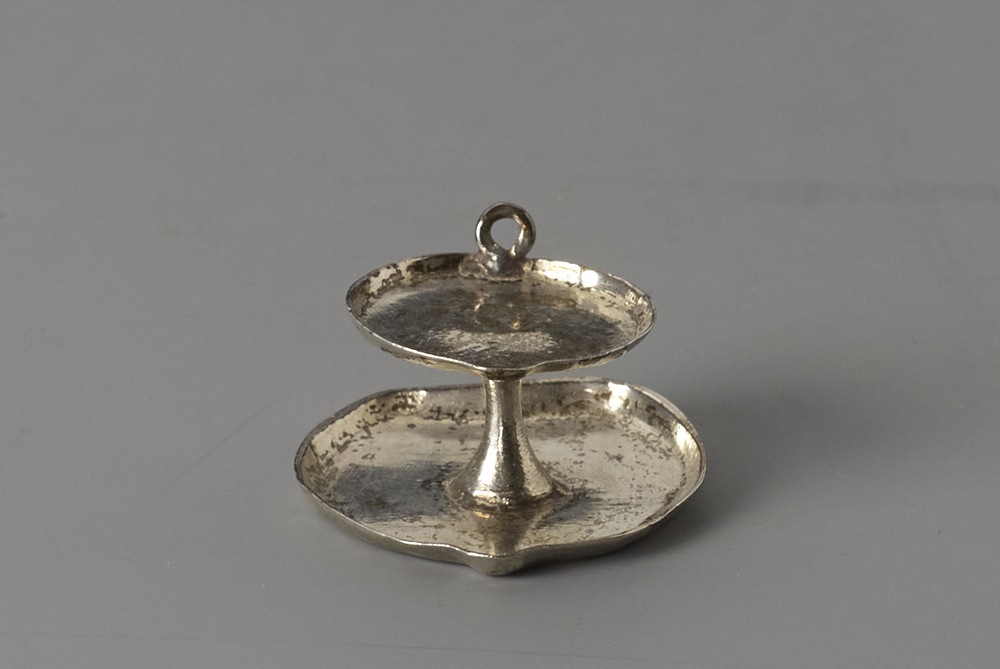 Olielamp met een plat rond bakje met tuit op stam met schotel.