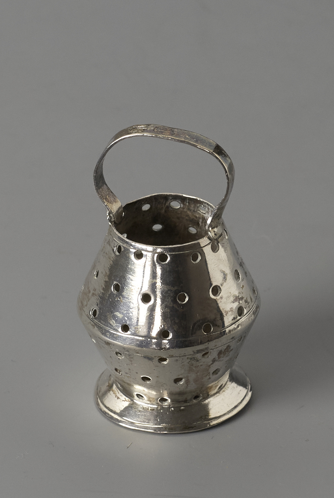 Viskorf, dubbelconische emmer op een ronde voet. In de wand zijn zes rijen gaten en gegraveerde lijnen. De emmer heeft een vast hengsel.