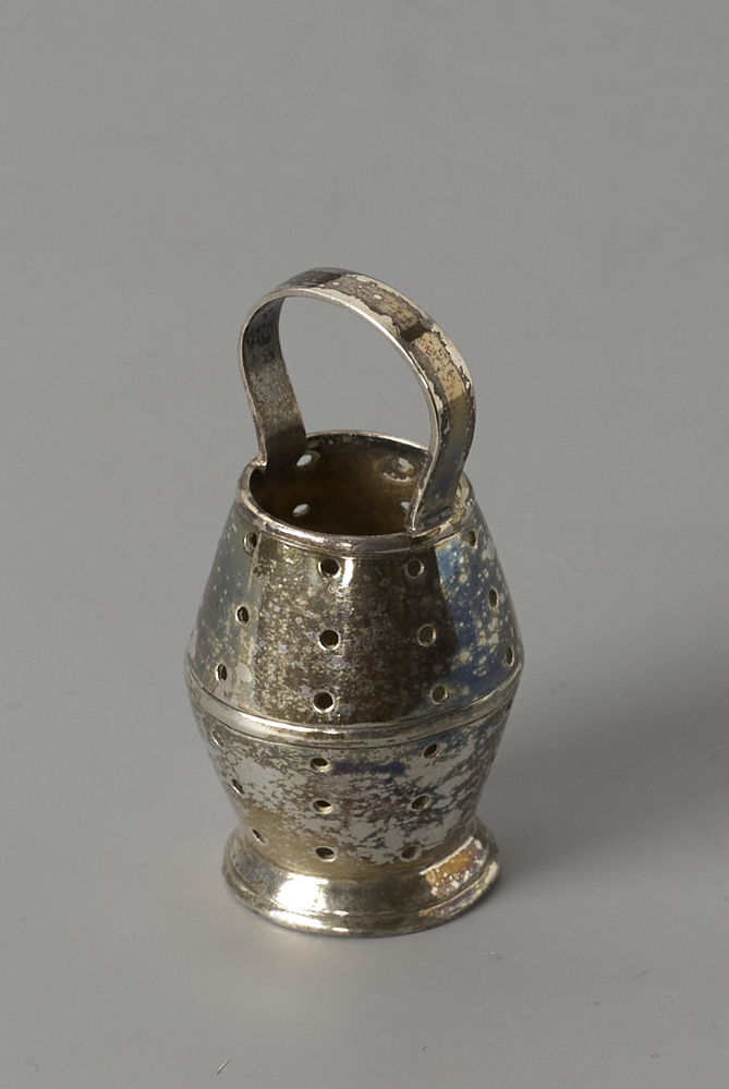 Viskorf, dubbelconische emmer op een ronde voet. In de wand zijn zes rijen gaten en gegraveerde lijnen. De emmer heeft een vast hengsel.