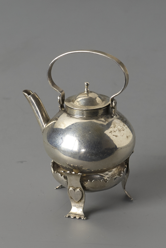 Ketel met bolvormig lichaam en scharnierend hengsel, het komfoor op drie pootjes versierd met een hartje.