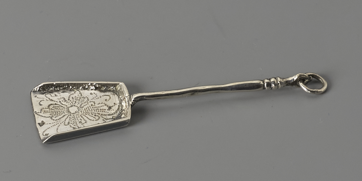 Haardschep met een licht getorste steel, binnenkant schep versierd met een bloemmotief.- Trefwoorden