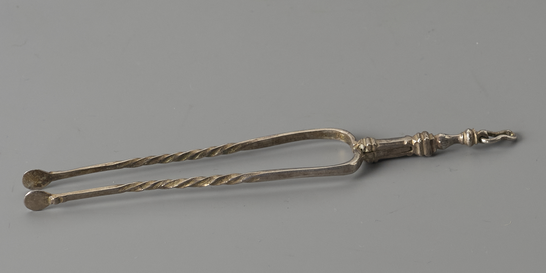 Haardtang met getorste benen en ronde einden, met ophangoog.- Trefwoorden