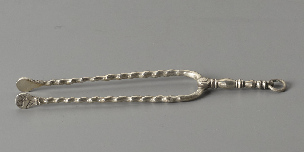Haardtang met getorste benen, met korte greep en ophangring.