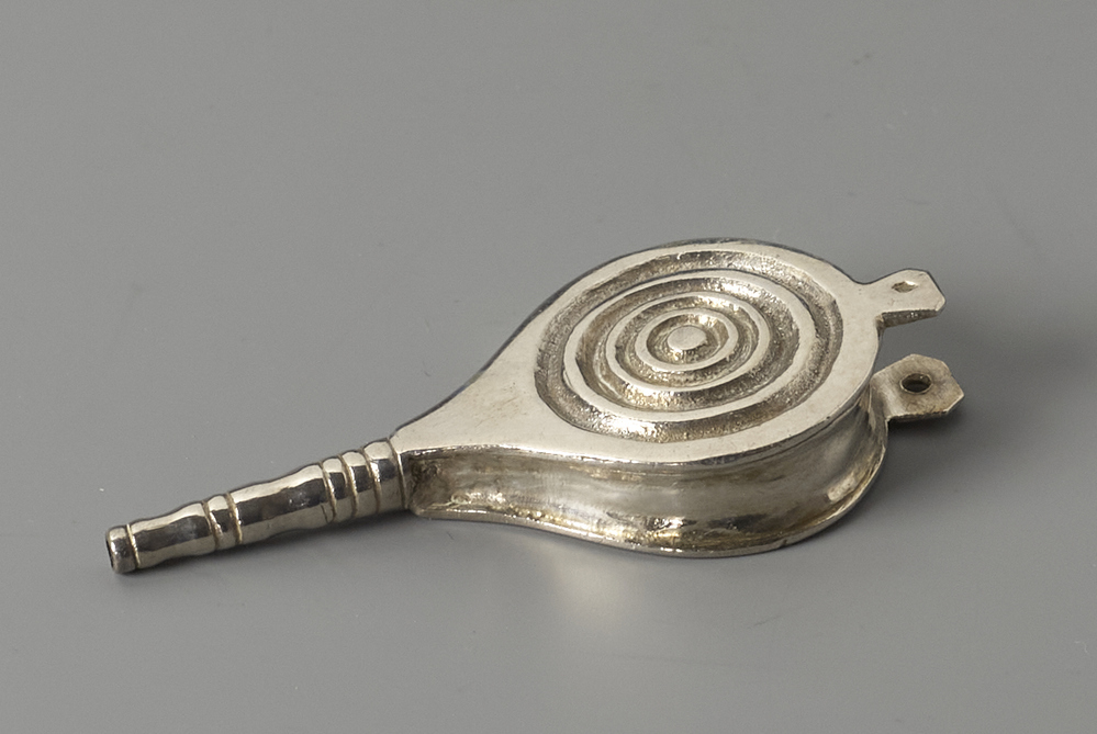 Blaasbalg met geprofileerd mondstuk en concentrische groeven op de balg.- Trefwoorden