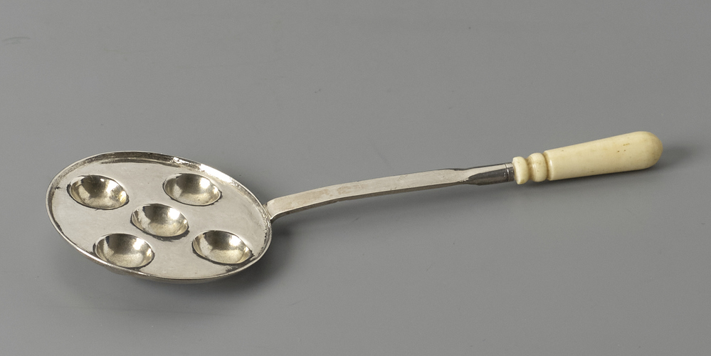5-Gaats poffertjespan met platte korte steelaanzet, eindigend in een manchet waarin een (latere) benen (?) heft.