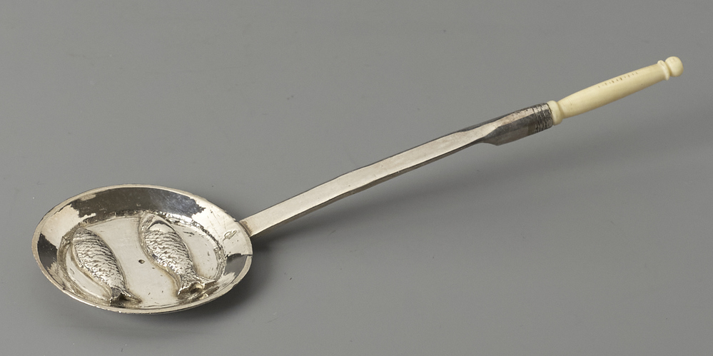 stadskeur onderzijde steel: wapen met drie vissen boven een kroon
