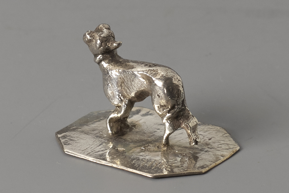 Hond met omkijkende kop staand op voetplaat met afgesneden hoeken.- Trefwoorden