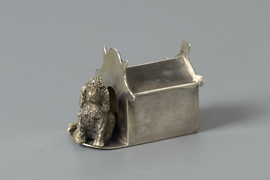 Hondenhok in de vorm van een huis met bij de ingang een hond.