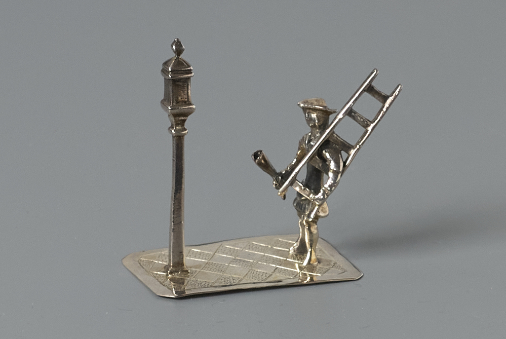 Rechthoekige grondplaat met lopende man die onder zijn linkerarm een ladder vasthoudt en in zijn rechterhand een toorts.- Trefwoorden