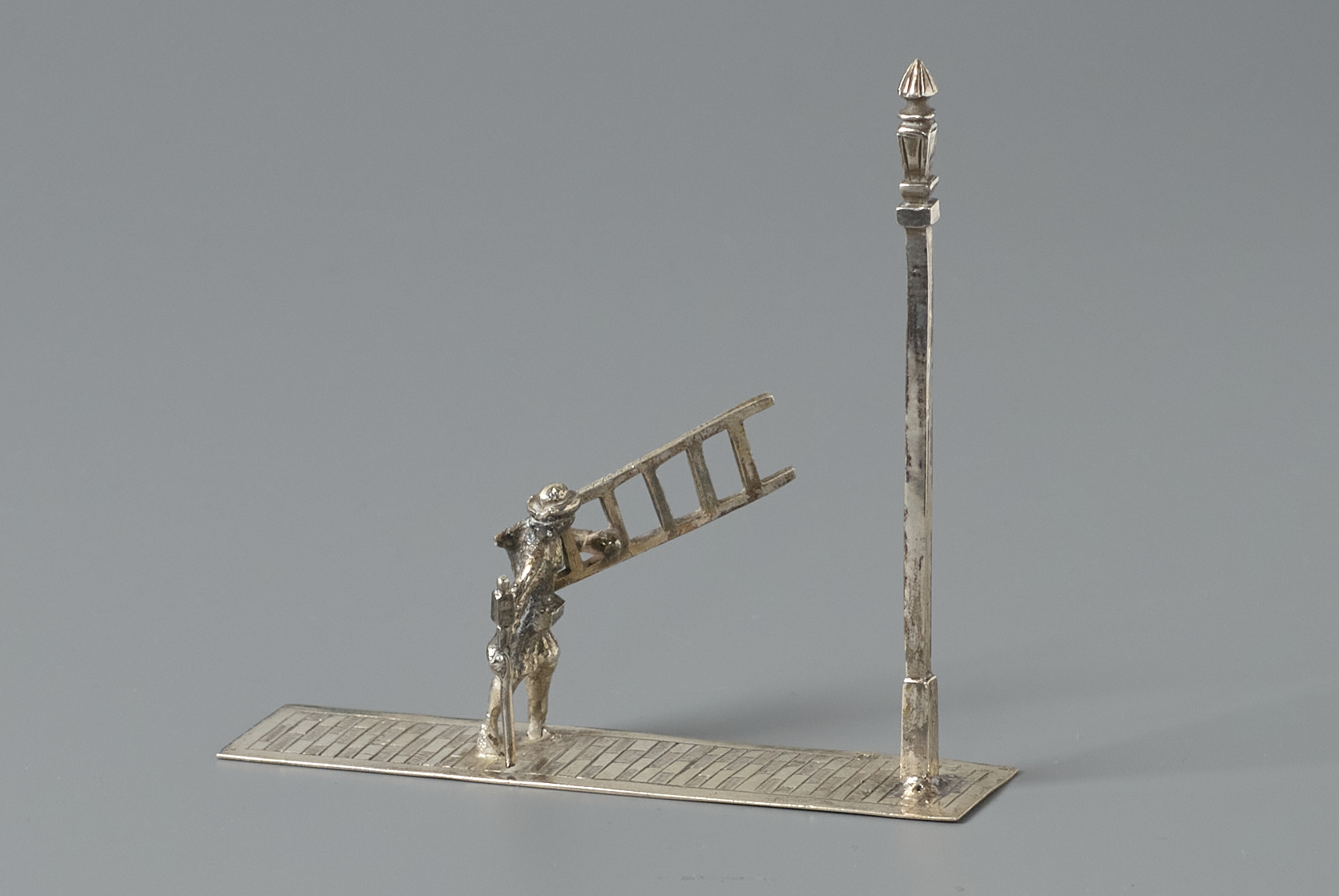 Rechthoekige grondplaat met lopende man die onder zijn linkerarm een ladder vasthoudt en in zijn rechterhand een toorts.
