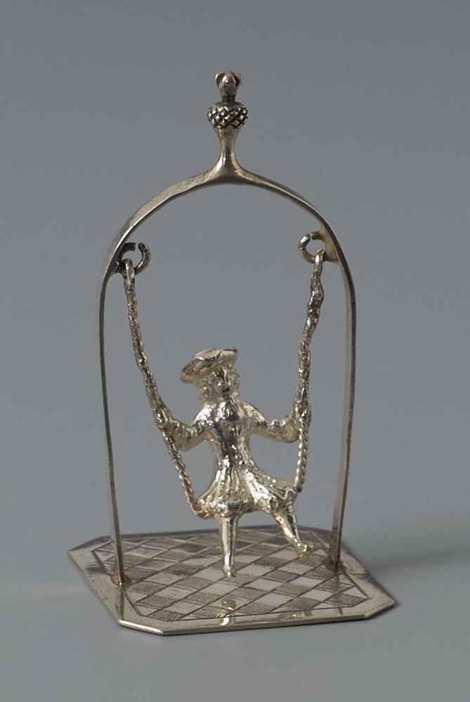 Op een 8-kantige grondplaat met ruitmotief met een kind op een schommel.- Trefwoorden