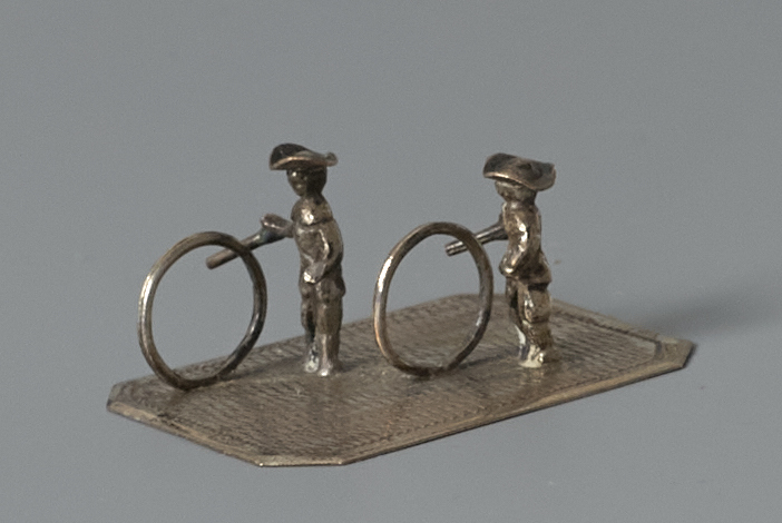 Op een rechthoekige plaat twee kinderen die met een een hoepel spelen.