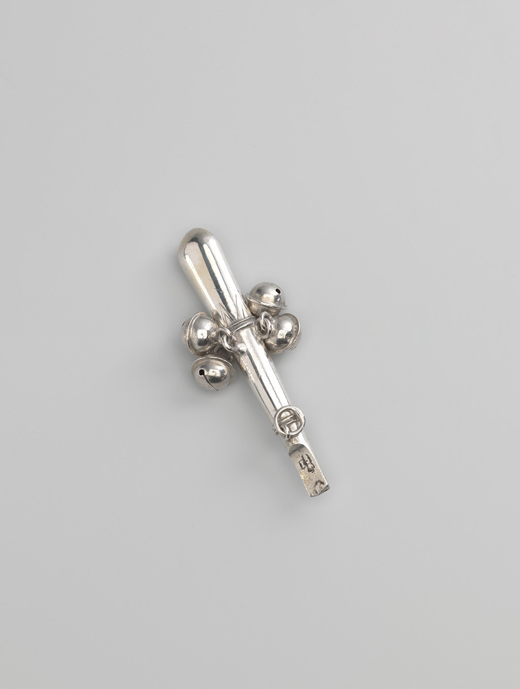 Een rammelaar werd in de achttiende eeuw een kinder- of rinkelbel genoemd. De meeste bezaten belletjes en een fluitje waarmee geluid kon worden gemaakt. Bezorgde ouders kenden hier een beschermende werking aan toe. Ook deze miniatuur heeft belletjes die kunnen rinkelen en een werkend fluitje. De verdikte greep is van zilver, bij de grote exemplaren was deze meestal van bergkristal of bloedkoraal. Zo’n greep diende als bijtstuk voor peuters die last begonnen te krijgen van het doorkomen van hun eerste tandjes. ( Bert Vreeken)
