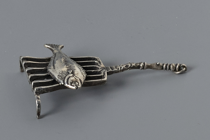 Treeft, 1980 - 2000 Willemstad zilver hoogte: 0.98 cm; breedte: 3.63 cm; diepte: 6.46 cm; gewicht: 13.36 gr; stadswapen onderzijde staart vis: lijkt op stadswapen Amsterdam eind 18e eeuw