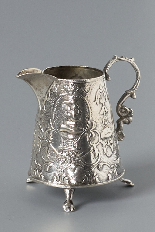 Waterkan op drie pootjes, de kan versierd met medaillions en met een S-vormige greep.
