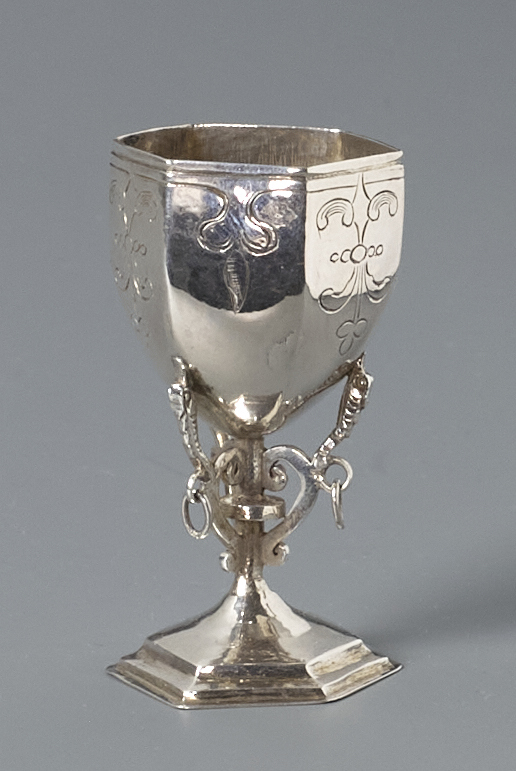 Beker op zeshoekige voet en sezkantige beker, versierd met renaissance-motieven.- Trefwoorden