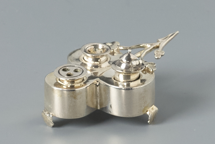 Houder met cilindrische wand, bovenzijde als drieblad waarin de houders met bladsteelvormige aangezette steel.
