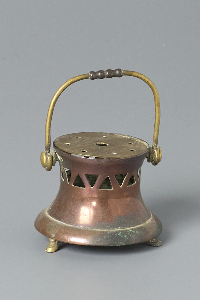 Komfoor op driepootjes sterk inlopende wand waaraan een U vormig hengsel met greep .- Trefwoorden