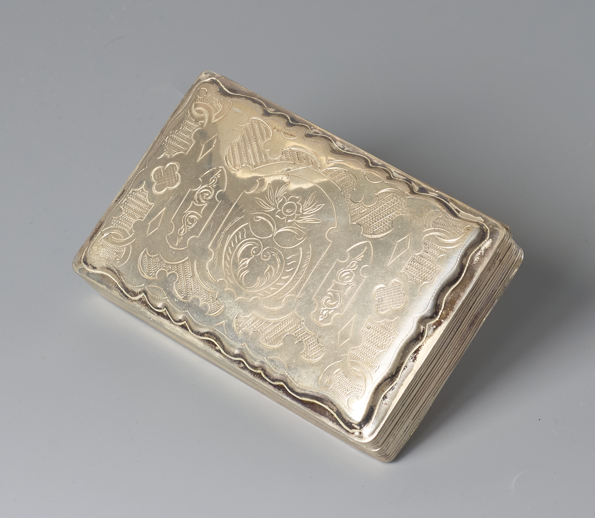 Rechthoekige tabaksdoos met gwelft, scharnierend deksel.- Trefwoorden