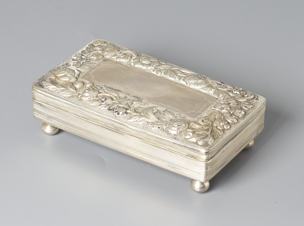 Rechthoekige tabaksdoos op bolpootjes, scharnierend deksel versierd met florale motieven.- Trefwoorden